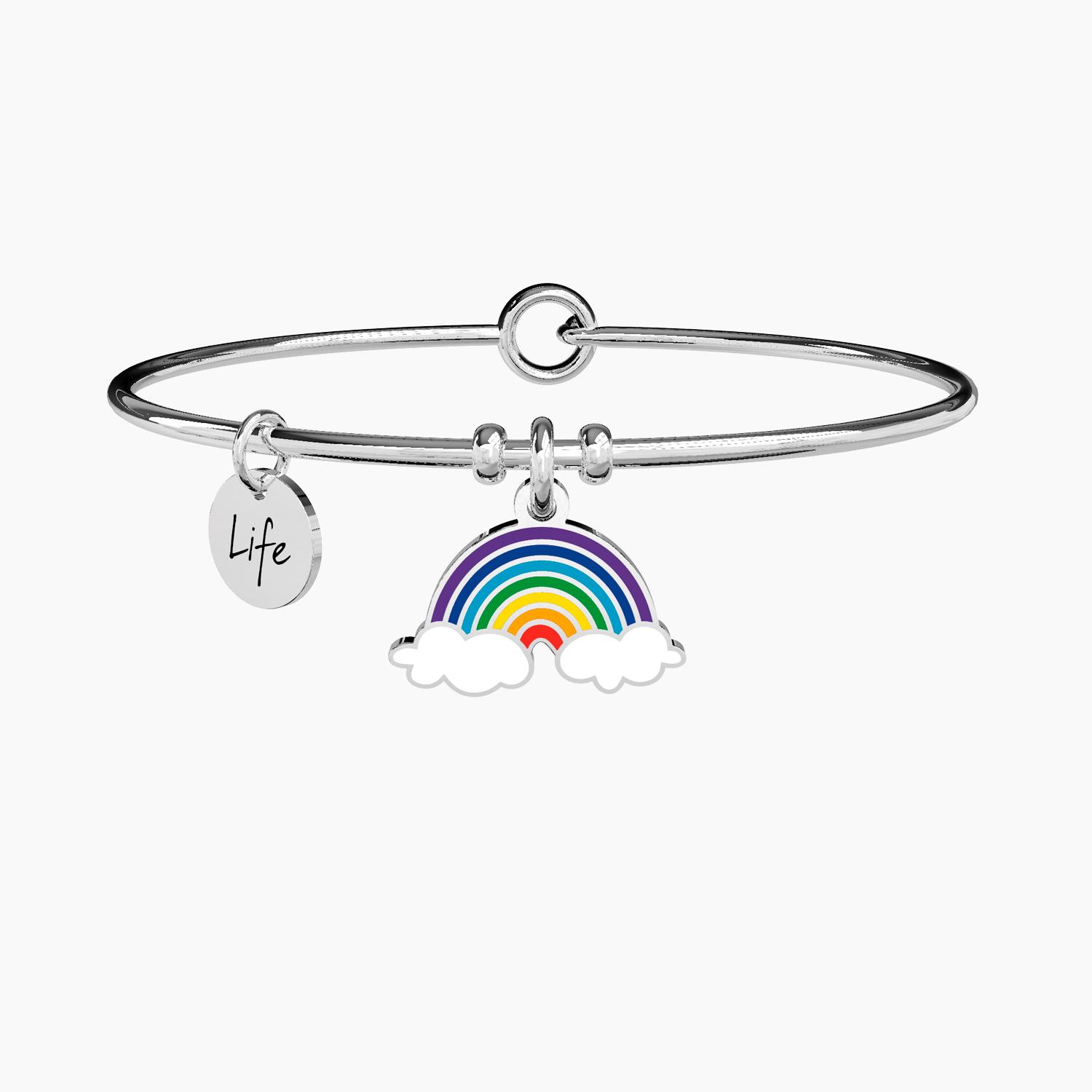 Bangle in acciaio con ciondolo a forma di arcobaleno smaltato.