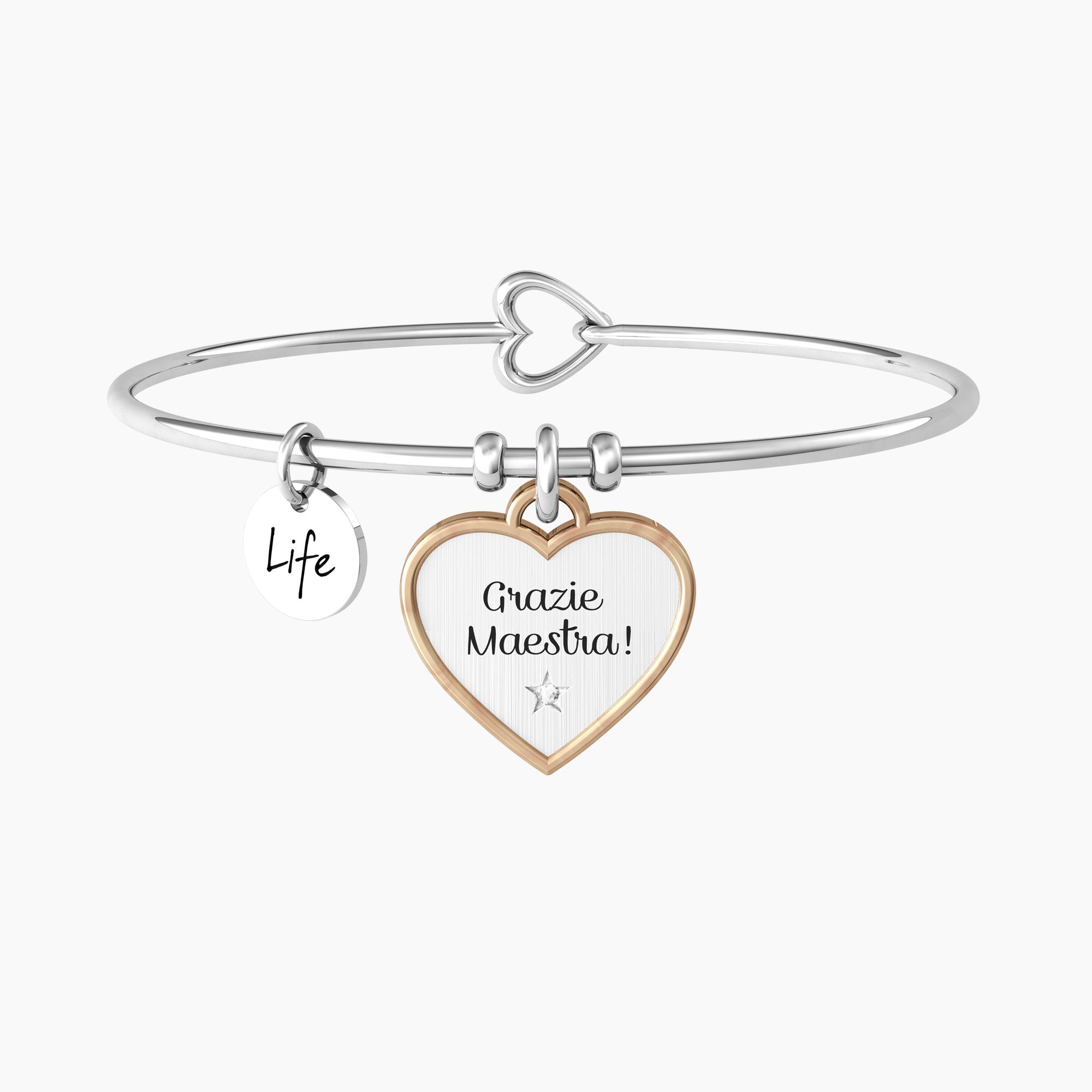 Bangle in acciaio con ciondolo satinato a forma di cuore con rifinitura lucida colo oro rosa, cristallo e scritta “Grazie Maestra! Le maestre speciali lasciano il segno”.
