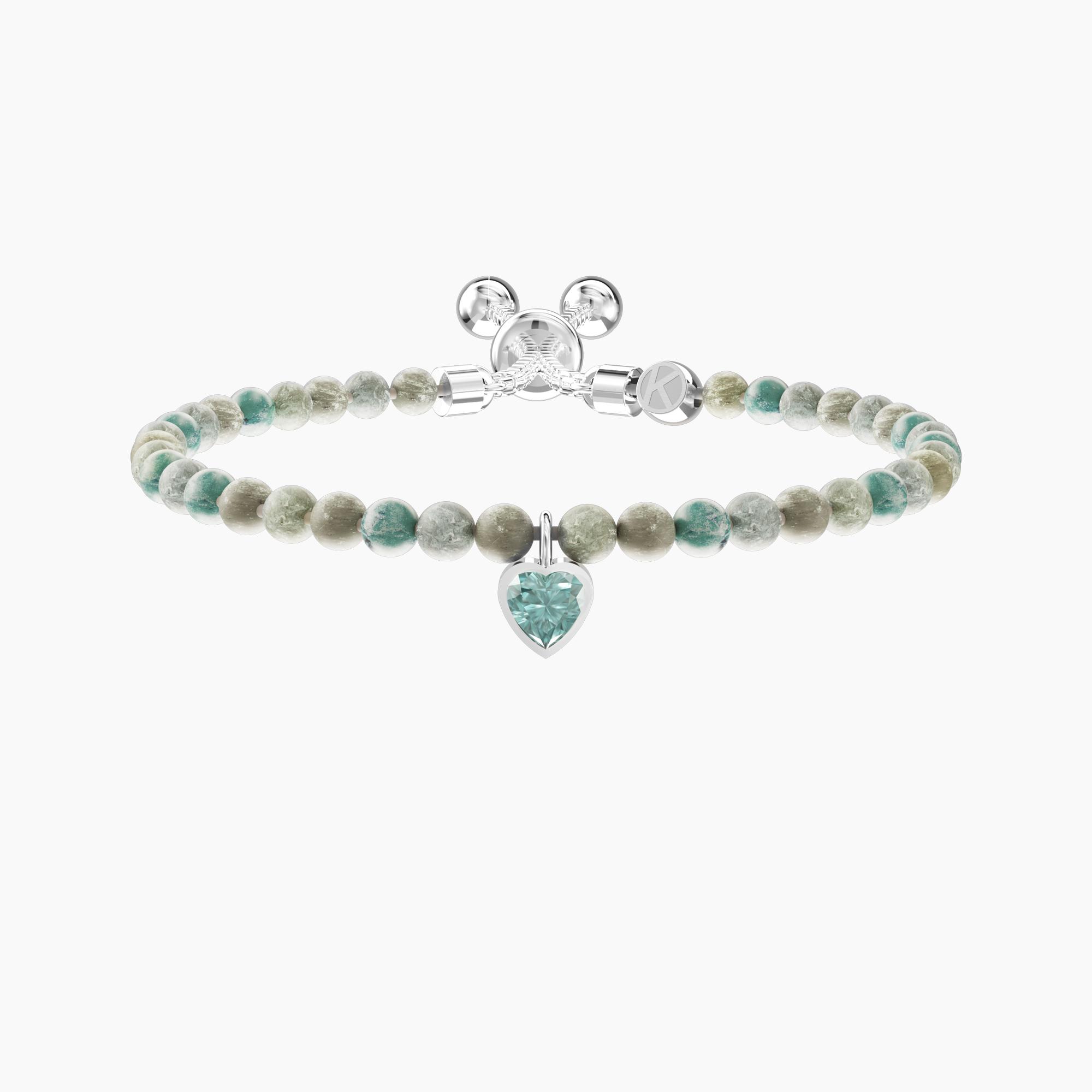 Bracciale regolabile in acciaio con catena veneta, diaspro imperiale azzurro striato e cristallo azzurro taglio cuore.