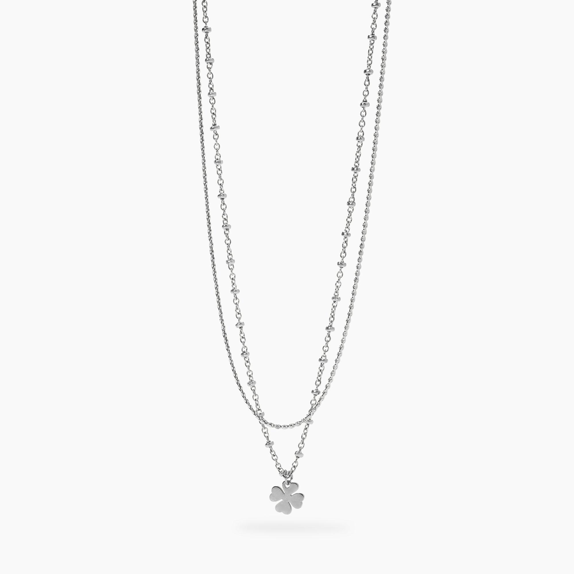 Girocollo regolabile in acciaio con catene rolò e serpentina, e ciondolo quadrifoglio.