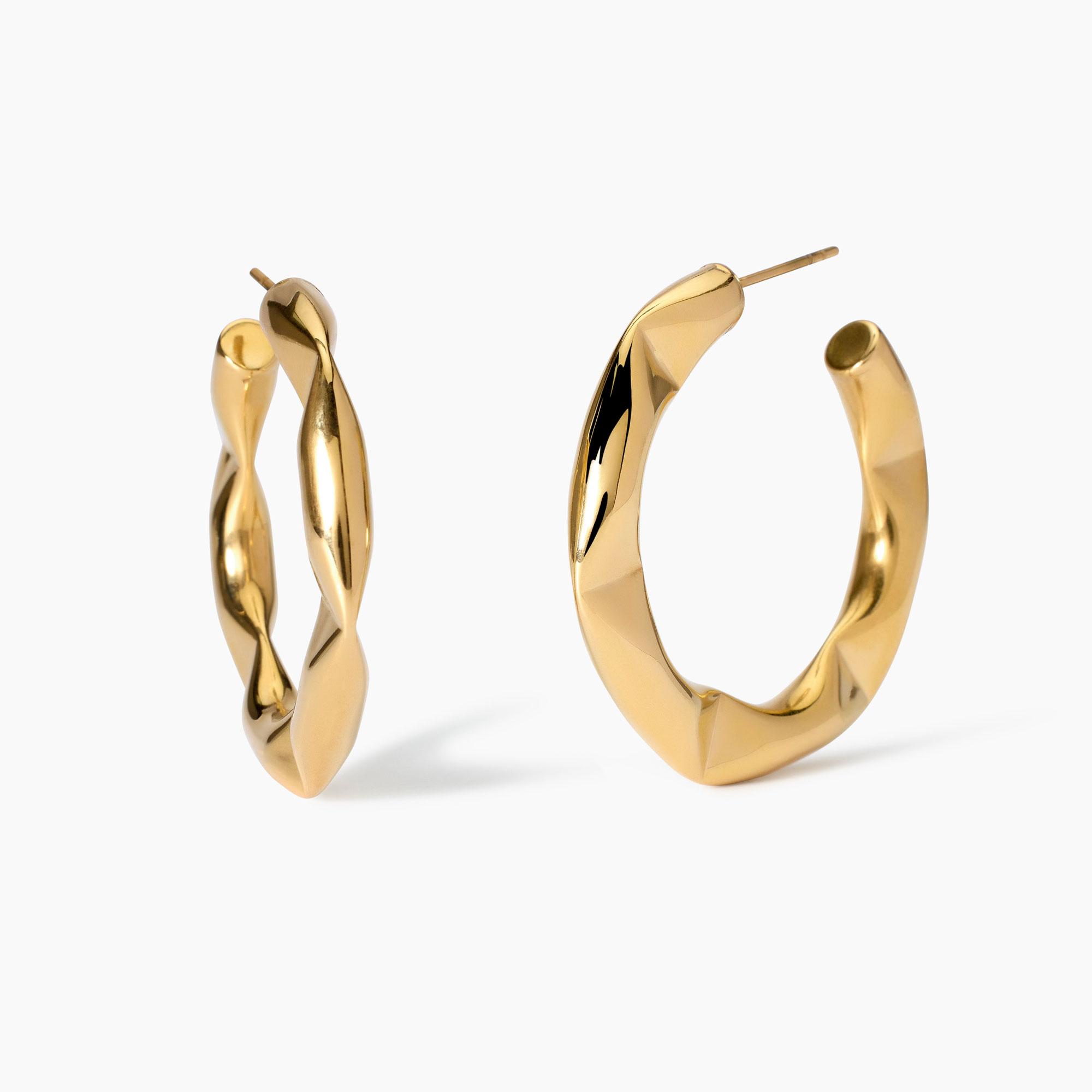 Orecchini poligonali in acciaio dorato. • Diametro esterno: 37,5 mm • Diametro interno: 24,5 mm • Materiale: Acciaio 316L, PVD giallo