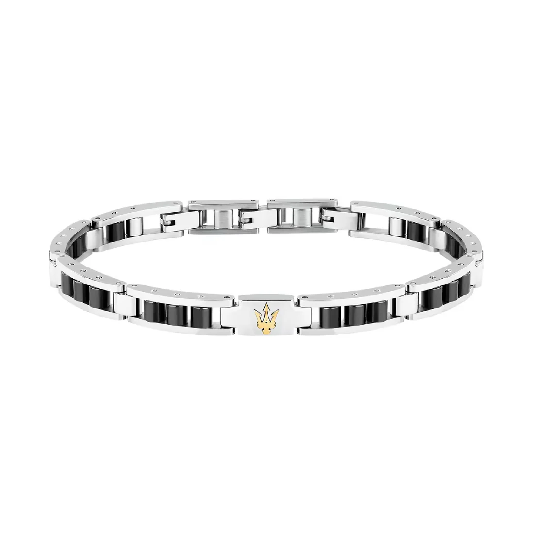 Bracciale catena della collezione Maserati Ceramic da uomo. Colore: argento e nero. Il gioiello è in acciaio 316L con elementi in ceramica caratterizzato da una sezione al centro con il logo del brand. Chiusura a gioielleria.