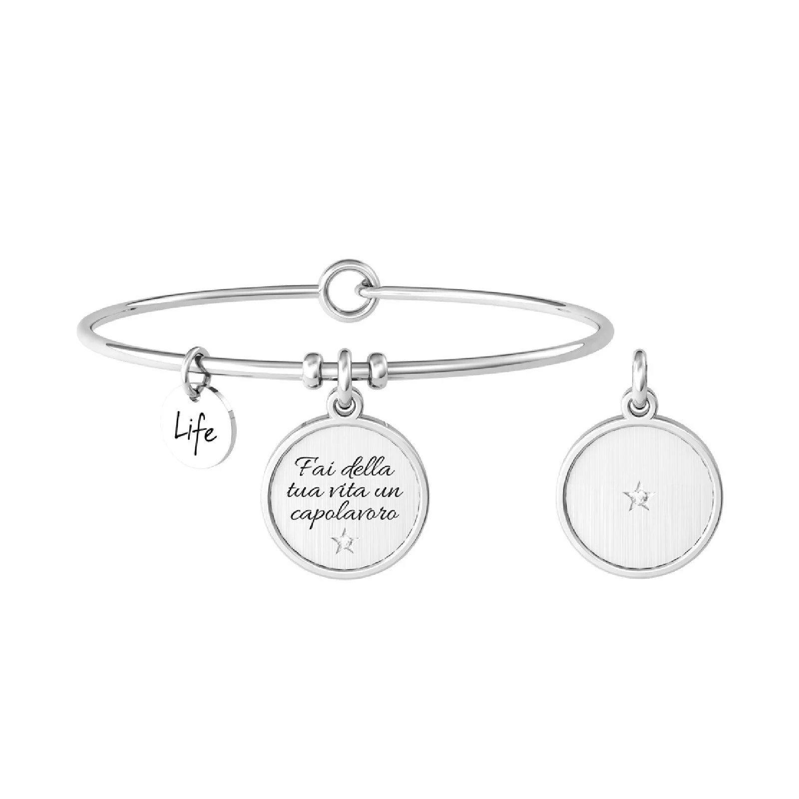 Bracciale rigido della collezione Kidult Philosophy da donna. Colore: argento. Bangle in acciaio inossidabile 316L con ciondolo tondo satinato e incisione smaltata sulla parte frontale “Fai della tua vita un capolavoro” impreziosito da un cristallo sul retro. Dimensione del ciondolo: 18 mm x 18 mm. Misura unica con chiusura a cerchio. Designed in Italy by Kidult.