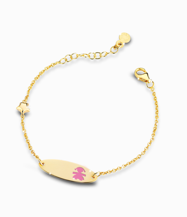 Bracciale Classico bimba in oro giallo con stellina e targhetta ovale con sagoma femminuccia smaltata color rosa.