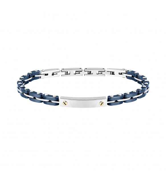 Braccialetto da uomo realizzato in acciaio anallergico rodiato e ceramica blu. Targa centrale incidibile.