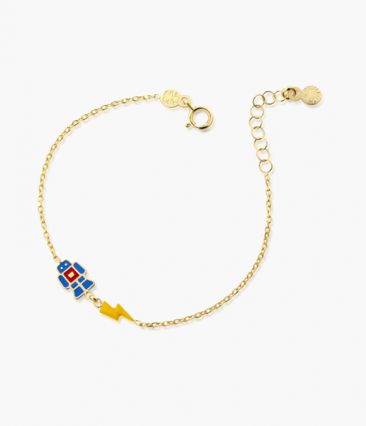 Bracciale in oro giallo 9 kt con sagome smaltate di un robot ed un fulmine. Un ottimo pensiero per un battesimo o per una nascita.