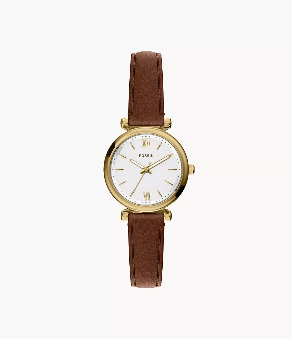 Orologio donna fossil, ES5464, collezione carlie, movimento al quarzo, solo tempo, cassa in acciaio dorato 28mm, quadrante bianco, vetro zaffiro, cinturino in pelle marrone, resistenza all’acqua 5atm,