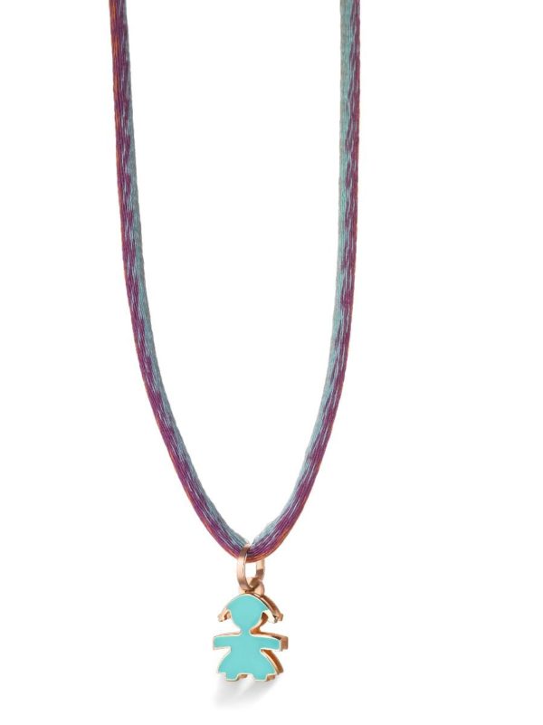 Ciondolo bombato Bimba in Oro Rosa 9 Kt e smalto verde acqua, con cordino degradè regolabile di 80 cm.