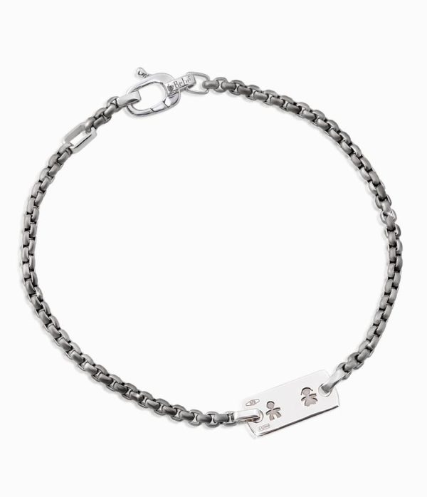 Bracciale in titanio con piastrina e moschettone in oro bianco 9 kt con incisione femminuccia e maschietto