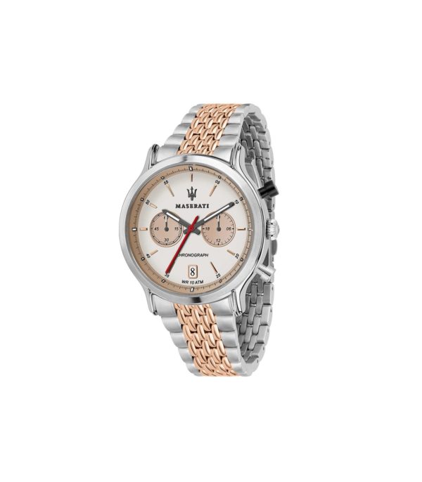 Orologio Maserati da uomo con movimento al quarzo Vk64 e funzioni di cronografo. La cassa rotonda realizzata in acciaio inox ha diametro di 42 mm con quadrante analogico nero, indici a bastoni silver, logo a ore 12 e datario a ore 6. Fondello in acciaio e vetro di tipo minerale. Il cinturino in acciaio inossidabile e anallergico color argento ha chiusura deployante con pulsanti. Resistente all’acqua fino a 100 metri di profondità.