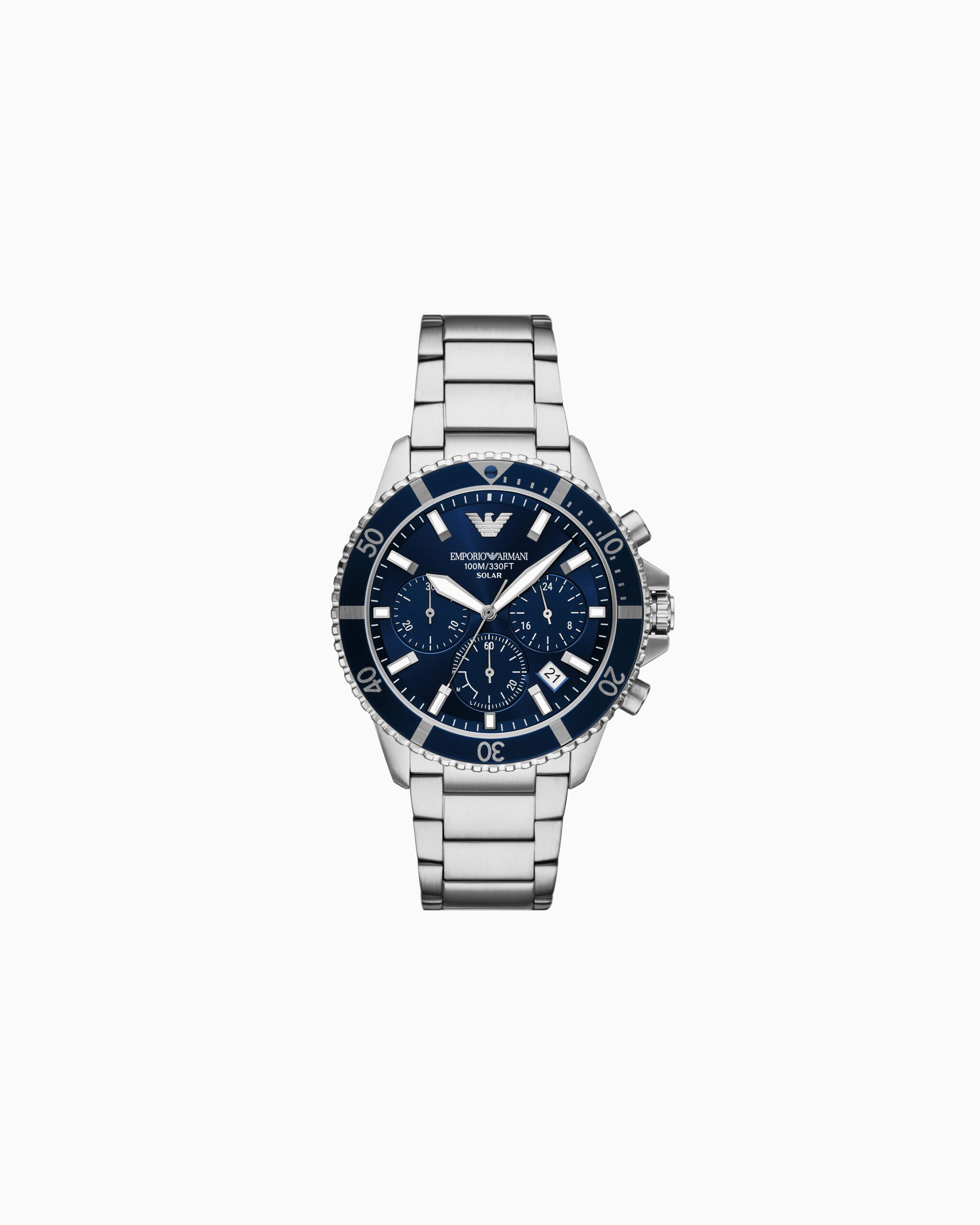 Cronografo World Explorer da 43,5 mm con quadrante a raggiera blu, vetro zaffiro e bracciale in acciaio.