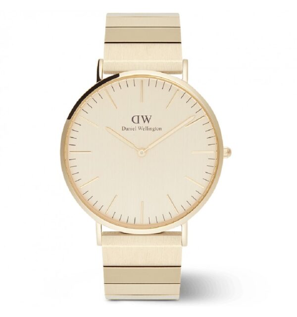 Quadrante gold (Dorato) con indici a bastoni e logo nella parte alta.