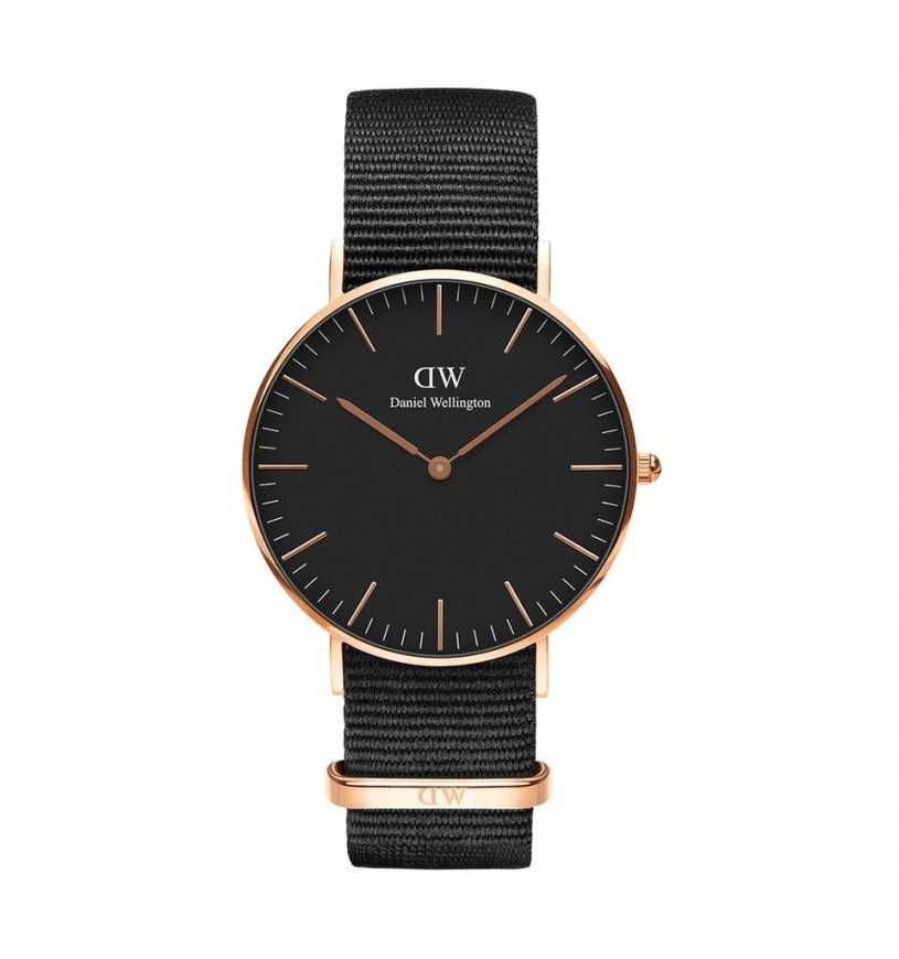 Quadrante nero con indici a bastoni e lancette rose gold. Cinturino in tessuto nero largo 18 mm. La chiusura con fibbia ardiglione è realizzata in acciaio 316L color oro rosa con finitura lucida.