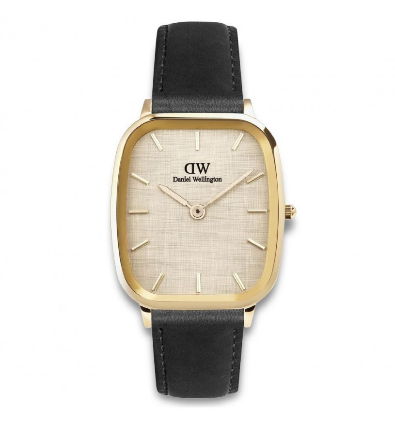 Quadrante color lino con indici a bastoni e logo nella parte alta.