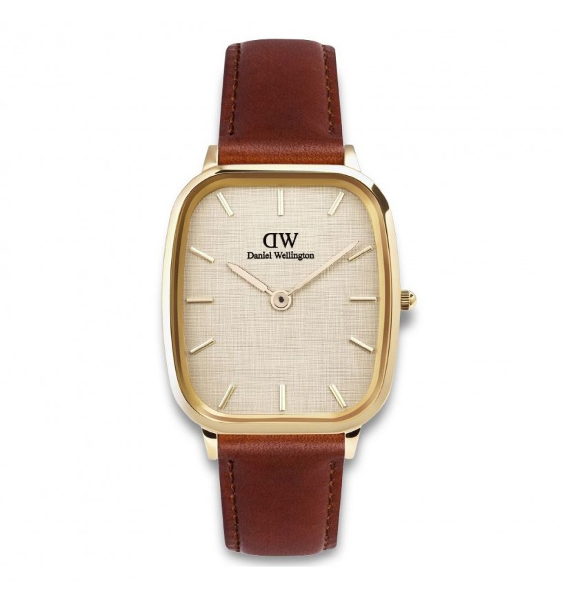 Quadrante color lino con indici a bastoni e logo nella parte alta.