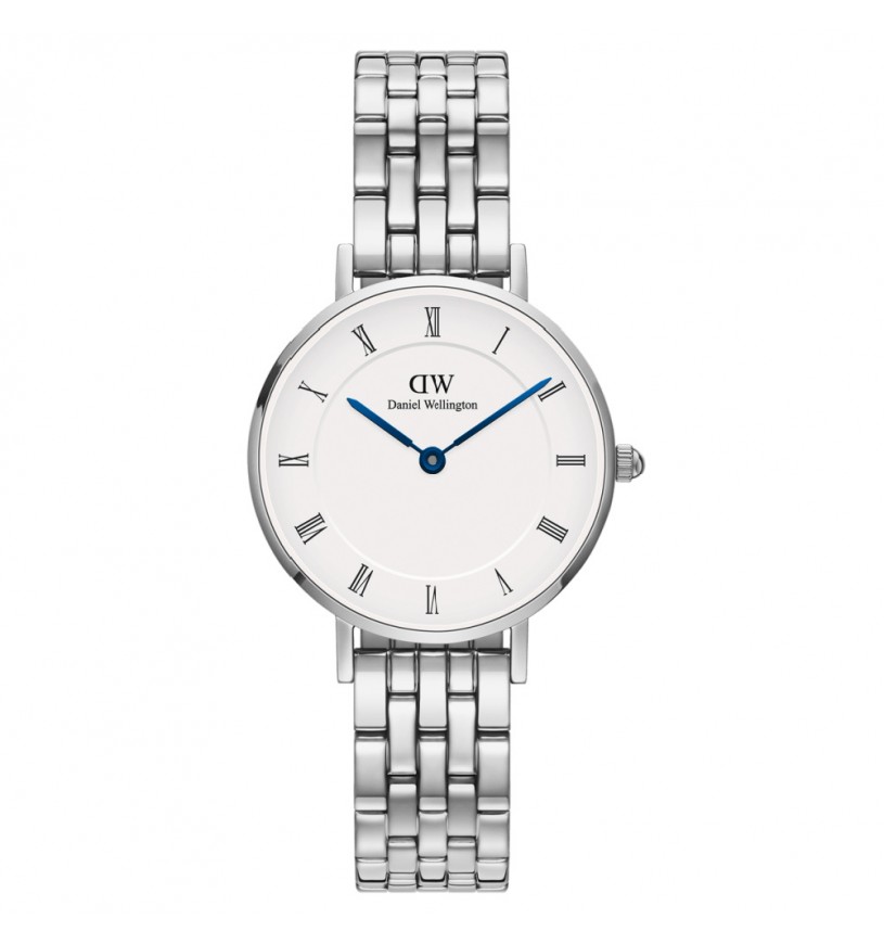 Quadrante bianco con indici a numeri romani e lancette azzurre.