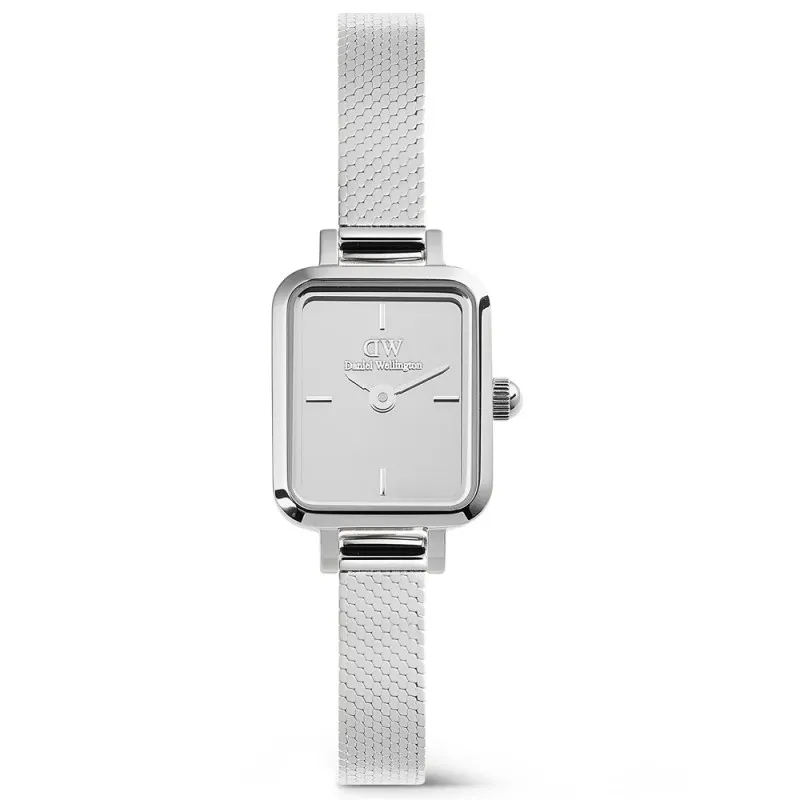 Orologio solo tempo da Donna DANIEL WELLINGTON della collezione QUADRO MINI REFLECTION SILVER con movimento al quarzo, cassa rettangolare 15.4 x 18.2 mm in acciaio inox 316L, spessore della cassa 6.00 mm, quadrante analogico in vetro a specchio silver e vetro minerale – Il cinturino è in acciaio inox con finitura lucida e monta una chiusura scorrevole e regolabile con gancio a scatto e blocco di sicurezza – Orologio impermeabile a 3 ATM quindi non si può immergere in acqua, ma resiste agli spruzzi e agli schizzi