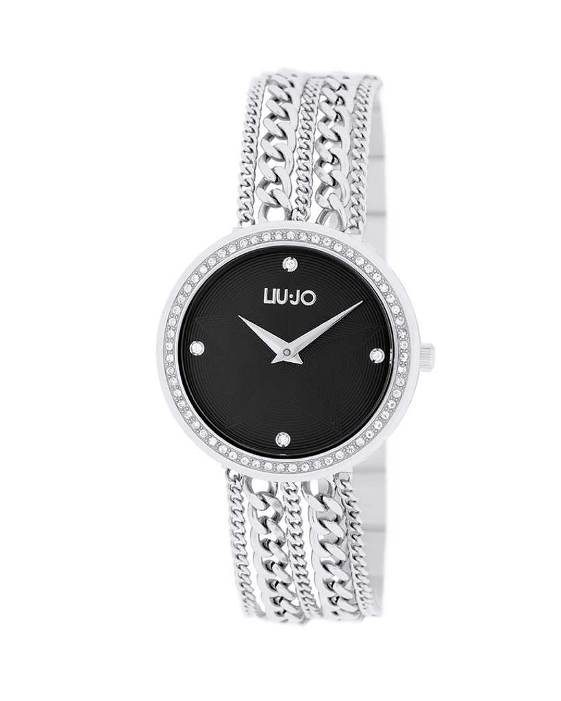 Orologio Donna Liu jo Tlj1831 della collezione Liu Jo Chains. Cassa di diametro 32 mm in acciaio inossidabile 316L e ghiera impreziosita da cristalli. Vetro minerale. Quadrante nero. Bracciale composto da multi catena in acciaio inossidabile 316L con chiusura regolabile. Movimento al quarzo. WR 3 ATM.
