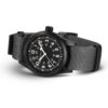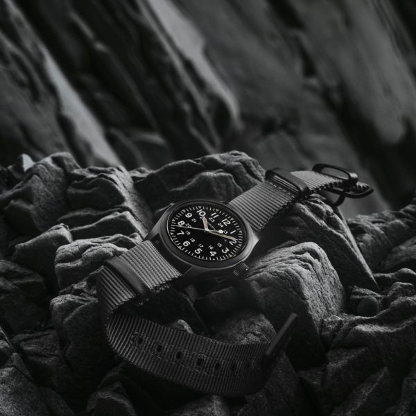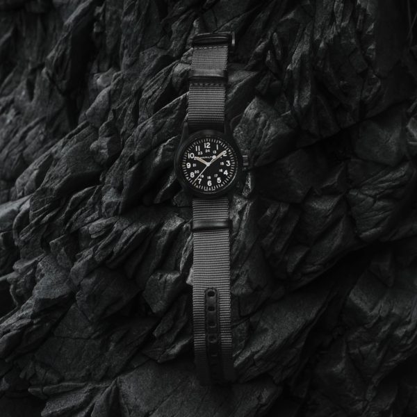 La palette nera e grigia di questo Khaki Field Mechanical rappresenta un approccio discreto allo stile militare. Animato dall’esclusivo movimento H-50 a carica manuale, è racchiuso in una cassa da 38 mm. Completano l’insieme gli indici triangolari in Super-LumiNova® di colore radio anticato, e un robusto cinturino NATO.