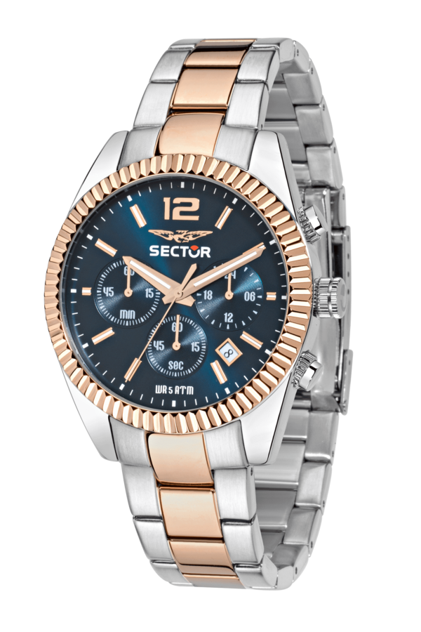 Orologio con cassa in acciaio color oro rosa dal diametro di 41 mm e dallo spessore di 12 mm. Quadrante color blu con datario e vetro minerale, Movimento al quarzo. Cinturino in acciaio con dettagli Oro rosa, chiusura Fibbia Deployante.
