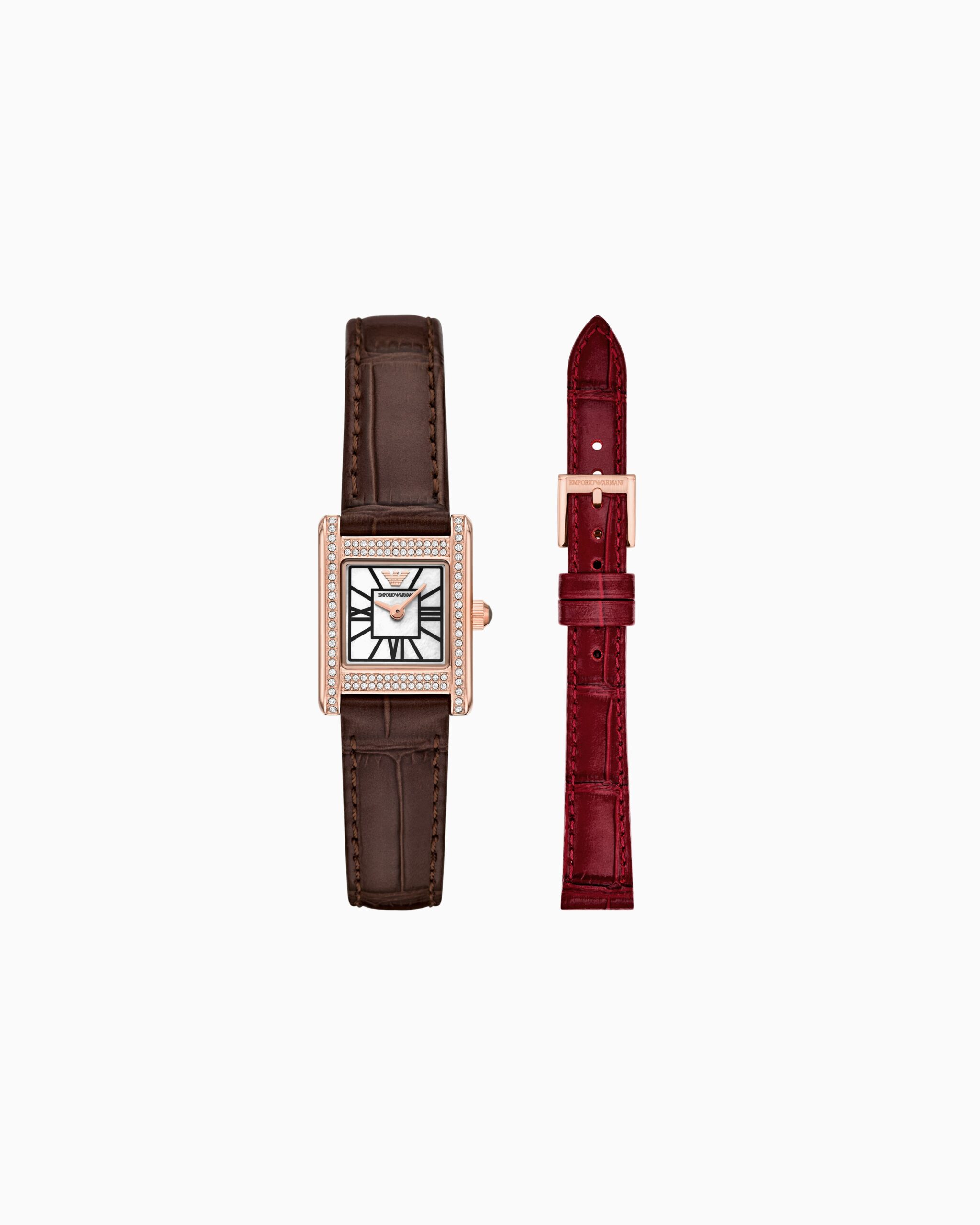 Regalo perfetto per le festività, questo set include cinturini in pelle intercambiabili, uno marrone intenso e uno bordeaux scuro, per completare qualsiasi look festivo
