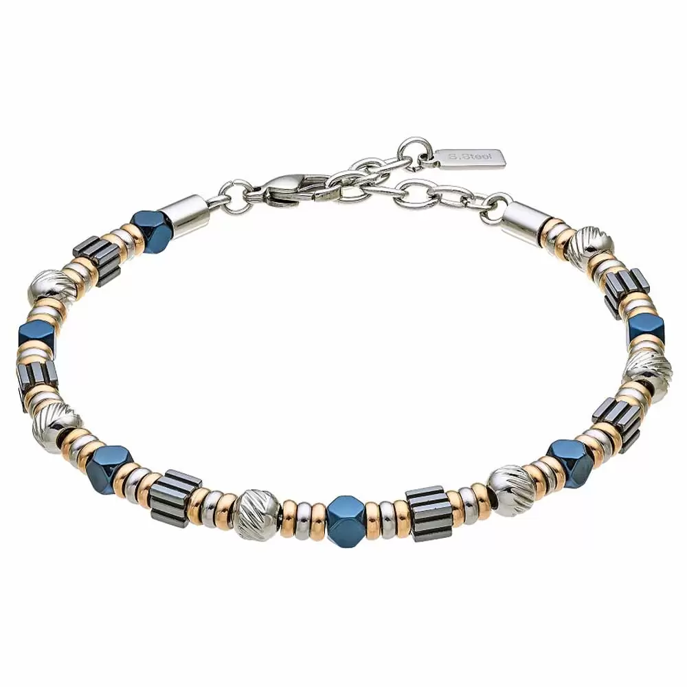 Bracciale Zancan con dischetti in acciaio 316L ipoallergenico lucido e rodiato, arricchito da bulles rigate rodiate e laminate. La misura è regolabile da 20 cm a 23 cm.